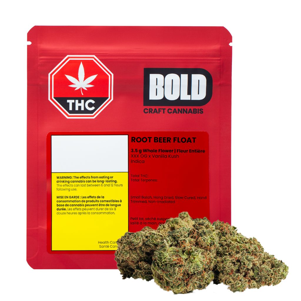 Root Beer Float is a rare indica dominant strain created through crossing XXX OG and Vanilla Kush. A sweet hazy, earthy bliss with hints of lemon and pine aroma. BOLD Craft Cannabis is indoor grown, small batch, hang dried, slow cured and hand trimmed. Dominant Terps include limonene, myrcene, linalool and caryophyllene. 30-34% THC.