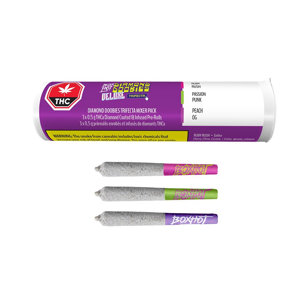 Lock and load – this mashed up trio of 0.5g diamond-drenched pre rolls are built for the brave. These dubious doinks come locked and loaded with botanical terp boosted liquid diamonds and a crushed THCa diamond coating for maximum strength and a smooth relentless burn. This lineup brings serious flavour firepower – a bold cherry hit that snaps with a citrus bite, a juicy peach twist layered with sweet earthy notes, and a tropical passionfruit explosion dripping with tangy, exotic vibes. At a rambunctious 60% THC, this 3 pack isn?t for the faint of heart – it’s a full throttle flavour riot, made for the bold and built to wreck the ordinary.