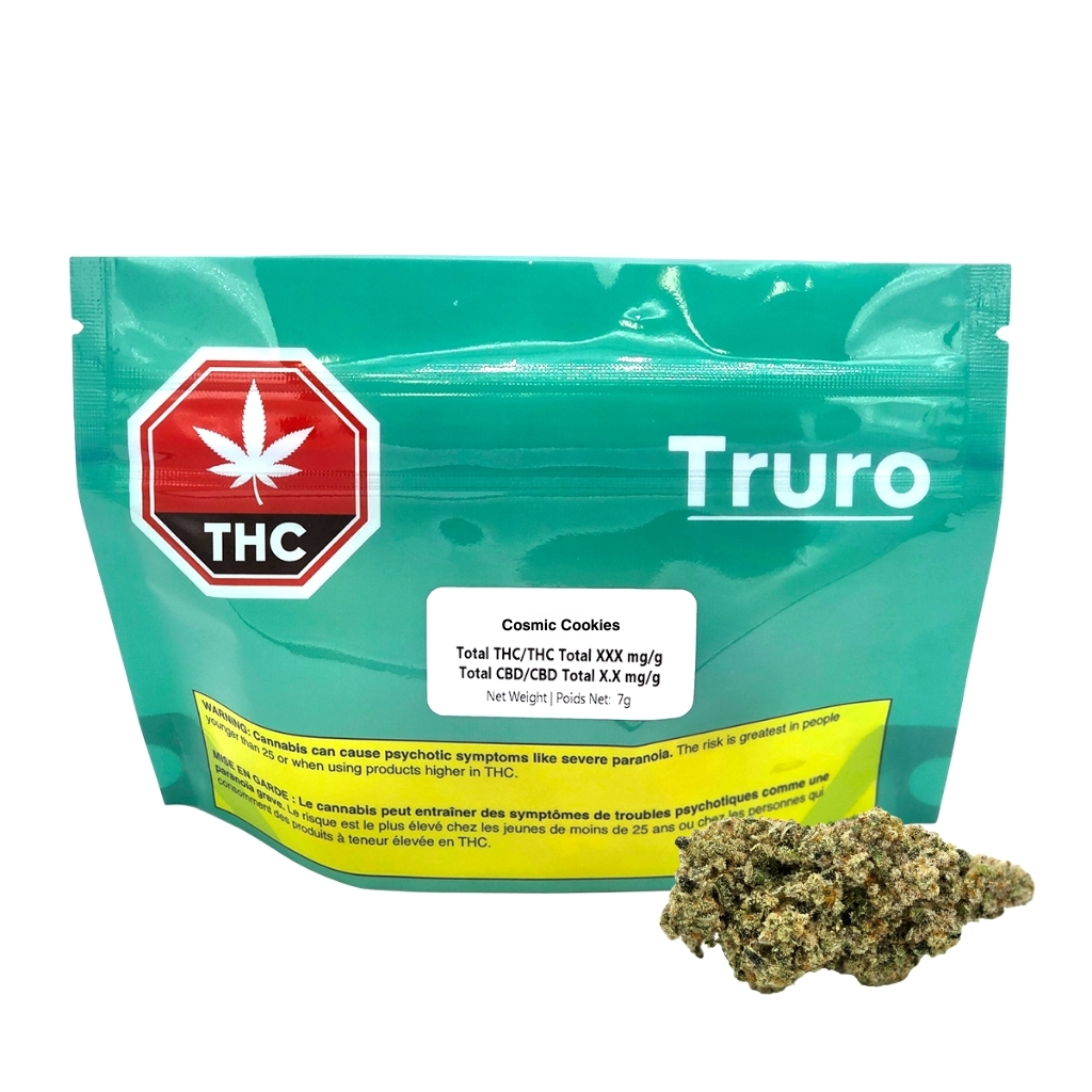 Cosmic Cookies by Truro Cannabis is a craft grown, sativa leaning flower with a THC range of 27-32%. This cultivar, bred from Caps Junky x Alien Cookies, features a sweet, citrus forward aroma with top terpenes Limonene, Linalool and Myrcene. Grown indoors in Truro, Nova Scotia, the flower is finished with a hang dry, hand trim and slow cure to preserve terpene expression, structure and overall quality.