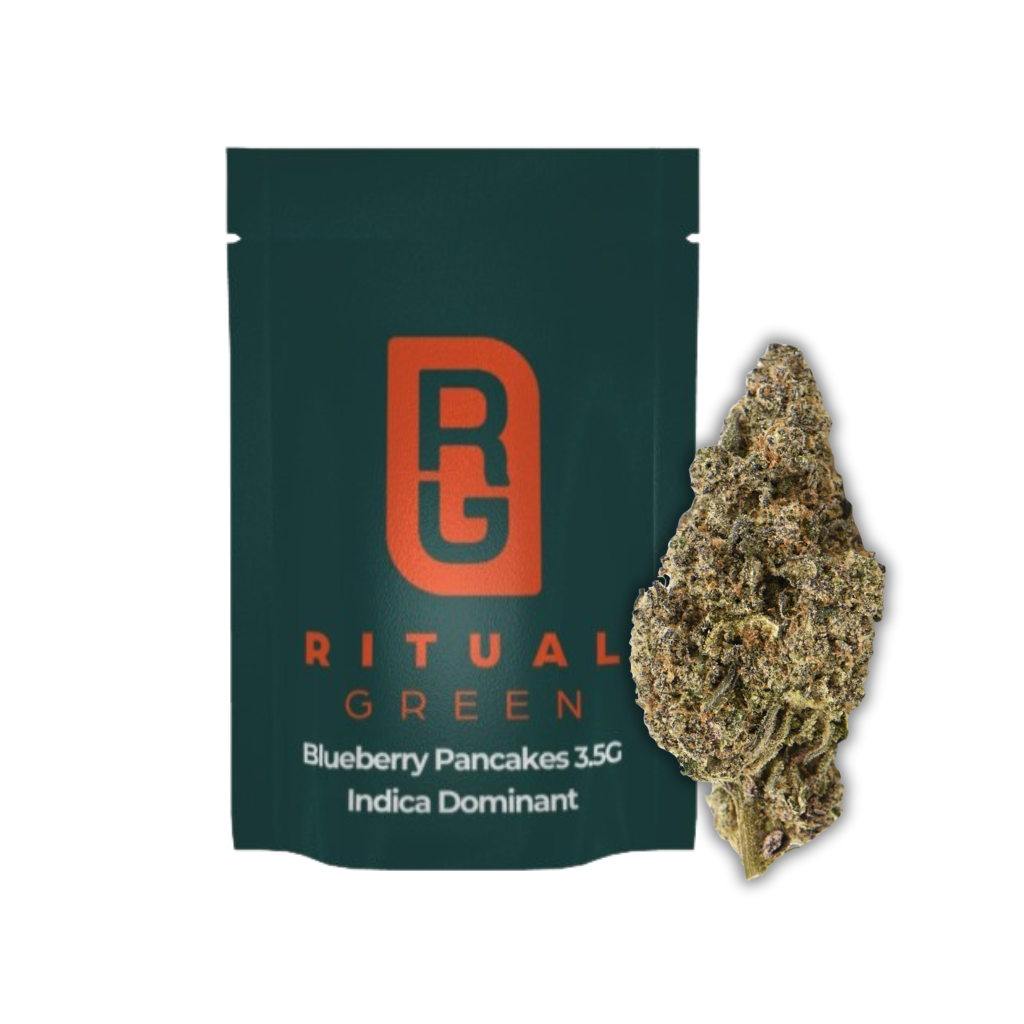 Craft Grown – Hang Dried – Hand Finished – Never Irradiated – Ritual Green Blueberry Pancakes is East Coast Craft at its most indulgent; pungent, colorful, and irresistible. This indica dominant cultivar tests between 28-35% THC and has a unique blend of dominant terpenes, Limonene, Myrcene, and Germacerne B. The result is a decadent blend of gas, fermented grapes and citrus.