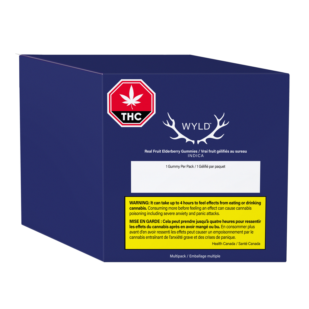 Wyld Elderberry Indica Enhanced THC:CBN gummies are a 2:1 product featuring a balanced dose of CBN. Made sustainably using real fruit, botanical terpenes and natural flavours. Each gummy contains 10mg THC and 5mg CBN for a total of 100mg THC and 50mg CBN per pack. All Wyld gummies are packaged in a fully compostable pouch, and our recipes are formulated by food scientists to provide consistent experiences that taste amazing. Wyld gummies use sunflower lecithin to improve bioavailability and onset time and are made to be thermostable up to 55C, with a firm texture that doesn’t stick to your teeth. Each Wyld Elderberry Indica Enhanced gummy contains 10mg THC and 5mg CBN combined with the terpenes myrcene, linalool, beta-caryophyllene, and terpineol.